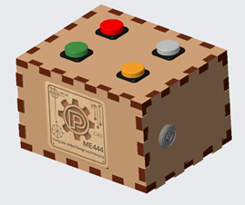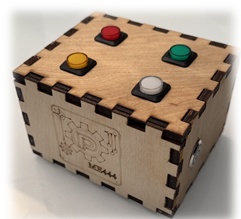 This toy features a laser-cut enclosure with four buttons. A programmed lighting sequence is randomly generated, and the player must replicate the same sequence by pressing the corresponding buttons to win. This toy was developed as a demonstration for the laser-cutting component of the toy design course I teach.